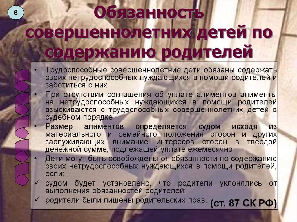 Трудоспособные дети обязаны помогать родителям. Это требование установлено на законодательном уровне, в ст. 87 СК РФ. Исключением являются случаи лишения родительских прав и злостного уклонения родителей от обязанности содержать ребенка до его совершеннолетия.