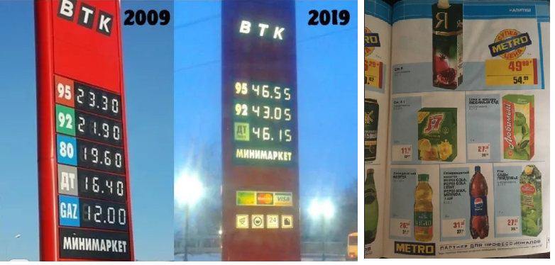 Просто для крупных чиновников огромная разница, в фразах Мы заработали на продаже нефти и газа или у Нас наблюдается, стабильный рост зарплат и благосостояния. Иногда даже используется название нашей страны, но имеется ли ввиду всё население и подразумевают ли чиновники именно нашу страну, когда говорят Россия, или говорим Россия, а подразумеваем Единая Россия! А действительно, как говорить, что у нас повышается доход населения, если цены растут намного быстрее, чем повышают заработные платы, может я не прав и дорогие читатели меня поправят в комментариях? Вот не так давно видел снимок рекламной брошюры за 2009 год, одного из сетевых супермаркетов, с тех пор прошло ровно 10 лет! В интернет даже целое движение началось по сравниванию цен, скажу прямо гордиться не чем!