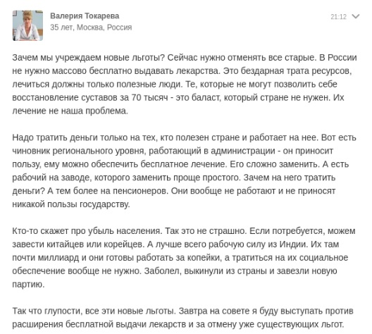 Вчера на сайте Самара. Ру увидела такое сообщение, в котором говорится, что Валерия Токарева, главный ортопед России готовясь к выступлению на Совете. Она планировала говорить о том, что льготы на лекарства для рядовых граждан не нужны.
