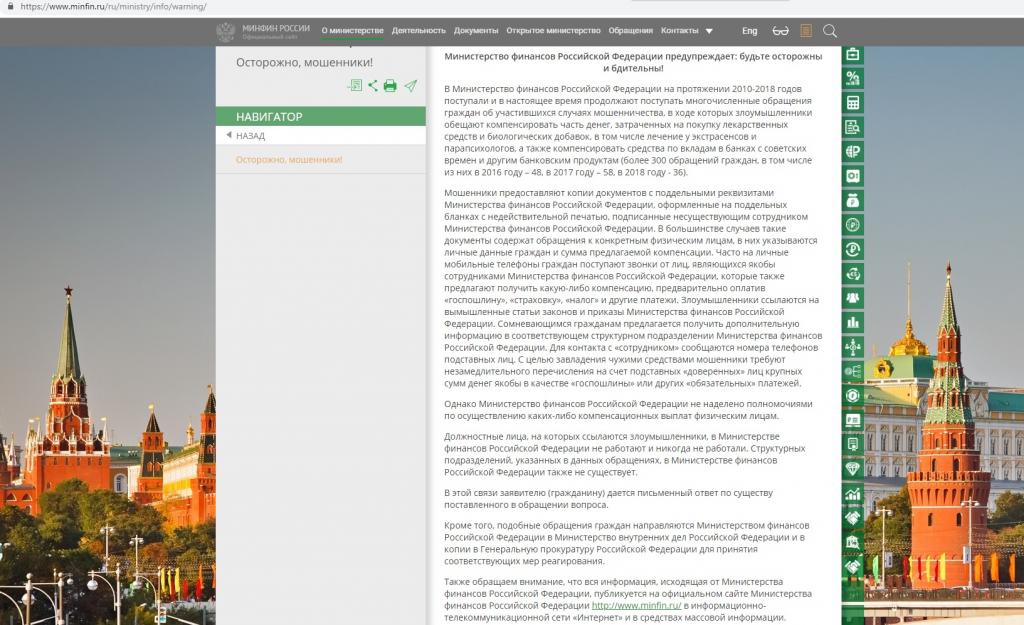 А тем временем, просто сравнив информацию, указанную в документах, с той, которая размещена на официальном сайте Минфина, либо позвонив по указанному на том же сайте номеру и уточнив достоверность информации о компенсации, жертва могла бы обезопасить себя и сохранить деньги. Да просто проверив информацию о возмещениях в Интернете, в первую очередь она увидела бы страницу официального сайта Минфина, на которой сообщается, что министерство не уполномочено производить какие-либо компенсации.