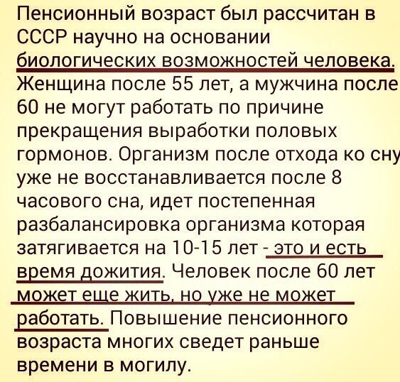 Очень всё правильно! Из народа хотят, да что там хотят, уже выжимают все соки. Все, до капли. Чтобы сил совсем на жизнь не осталось. У некоторых и не остаётся, умирают. А могли бы ещё и пожить. Я пенсионерка, мне почти 67 лет. Инженер, с высшим образованием. Выкинули в 90-х всех на улицу из проектных институтов, меня в том числе. С тех пор работаю в котельной. Помню себя в 55, сил работать уже было мало, здоровье пошатнулось. В 53 года первая онкологическая операция, в 54 - вторая. Выжила. Пенсия была небольшая, продолжила работу. Тяжело было, но пенсия была добавкой к зарплате. Что сделало правительство сейчас, это даже не знаю, как назвать. Мало того, что есть "работающие нищие", так теперь лишили предпенсионеров средств, которые люди ждали, как добавку к зарплате. Короче, после 55-ти, 60-ти лет, уже тяжело работать, здоровье оставляет желать лучшего. Не говорю уже об уровне медицины в нашей стране. Так что пенсионная реформа, правильно пишет Дмитрий 19 - "Не только ухудшит материальное положение, но и отнимет много здоровья, а кому-то это будет стоит жизни".