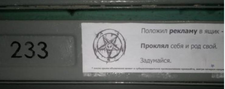 Ну а пока мы, жители, используем принцип «помоги себе сам». Кто-то нанимает консьержа, который не пускает посторонних, кто-то ставит в подъезде общую урну для макулатуры, многие просто не пускают незваных почтальонов в дом, когда те звонят в домофон. Кто-то собирает всю эту агитацию и возвращает непосредственно в офис отправителю. Некоторые пишут на своих ящиках и такое: