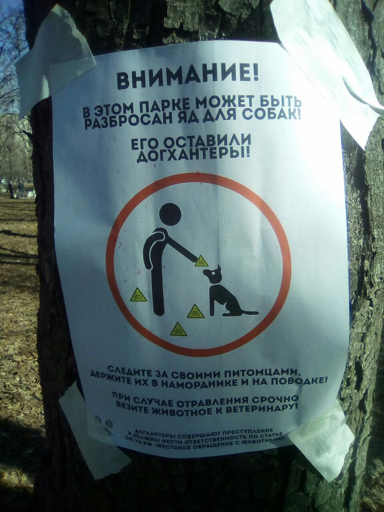 В парковой зоне на юге Москвы висит предупреждение о догхантерах, разбрасывающих яд