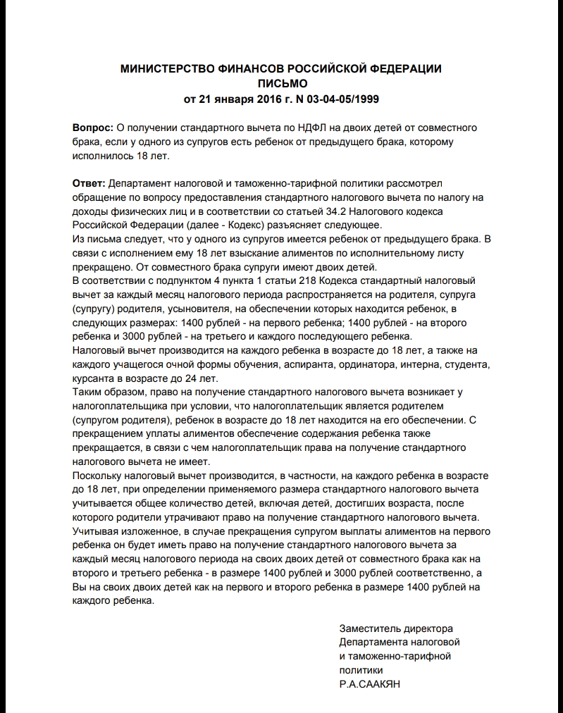 Возраст детей. Вычет положен до тех пор, пока ребенку не исполнится 18 лет. Причем, если ребенку исполнится 18 в середине года, право на вычет будет действовать до конца года. На детей, которые платно или бесплатно продолжат учебу на очном отделении, вычет продлят на весь срок обучения — максимум до наступления 24 лет.