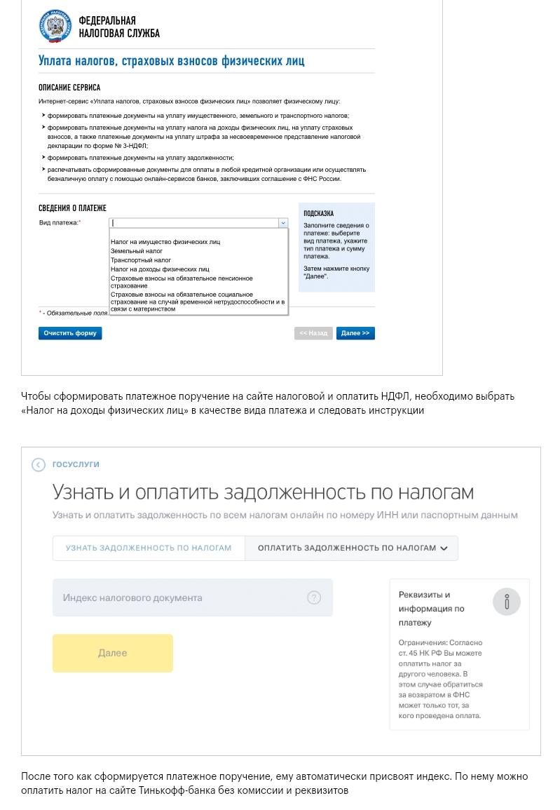 при помощи специального сервиса, который автоматически сформирует платежное поручение. Его можно оплатить электронно на сайте ФНС, через госуслуги или на сайте Тинькофф-банка;