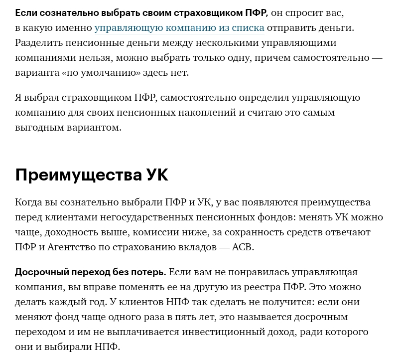В ПФР вы сами выбираете одну из УК и следите, какой инвестдоход она дает. Не понравится, поменяете — так сможете работать только с лидером.
