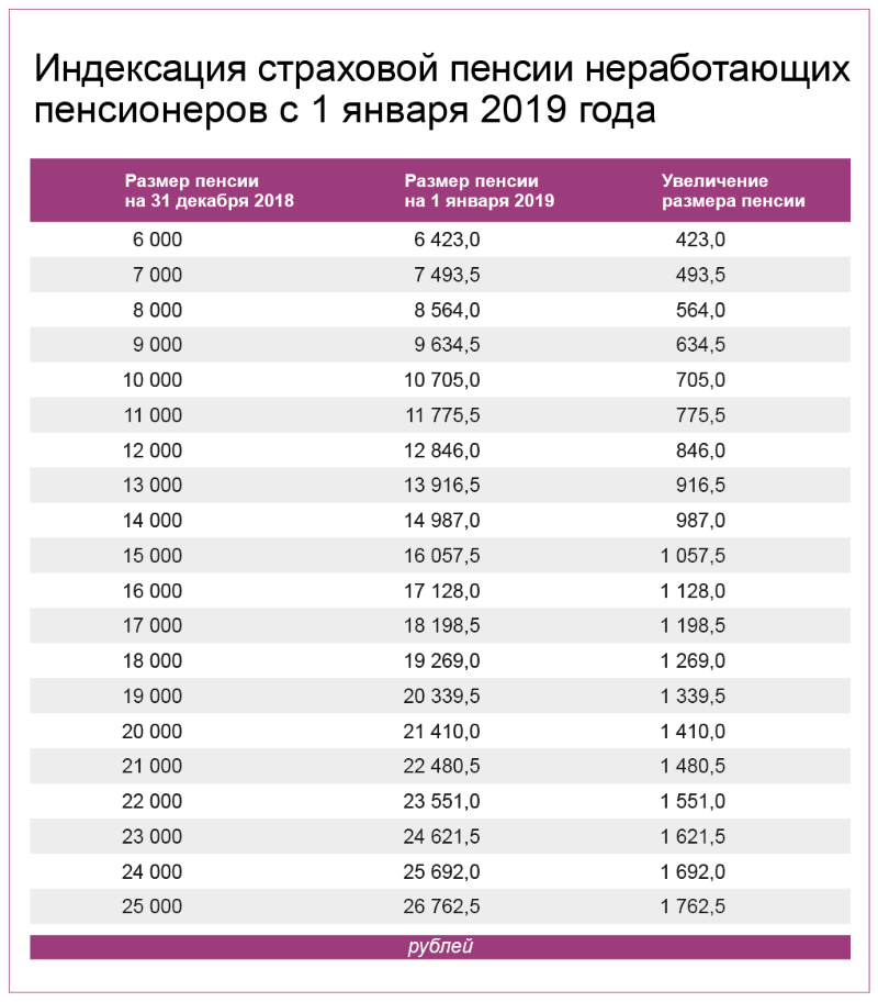 С 2019 года законом предусмотрена повышенная индексация страховых пенсий темпами, опережающими прогнозный рост инфляции. Страховые пенсии по старости неработающих пенсионеров в среднем будут расти на 1 тыс. рублей в месяц, или 12 тыс. рублей в год.