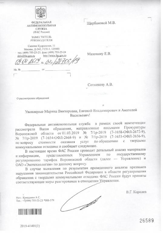 Областная прокуратура направила обращения в Центральный аппарат Федеральной Антимонопольной Службы России, которая проводит детальный анализ материалов, представленных Управлением по регулированию тарифов Воронежской области и ОАО "Экотехнологии".