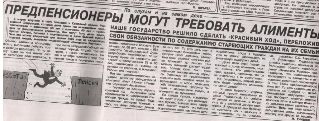 _ Я знаю безногого старика, который просит милостыню на улице Пушкинской. Он собирает деньги на лечение, а попросить денег у взрослой дочери стесняется. Я предлагал ему бесплатно составить иск и взыскать с нее алименты, но он отказался, _ рассказал С.С. Авраменко.