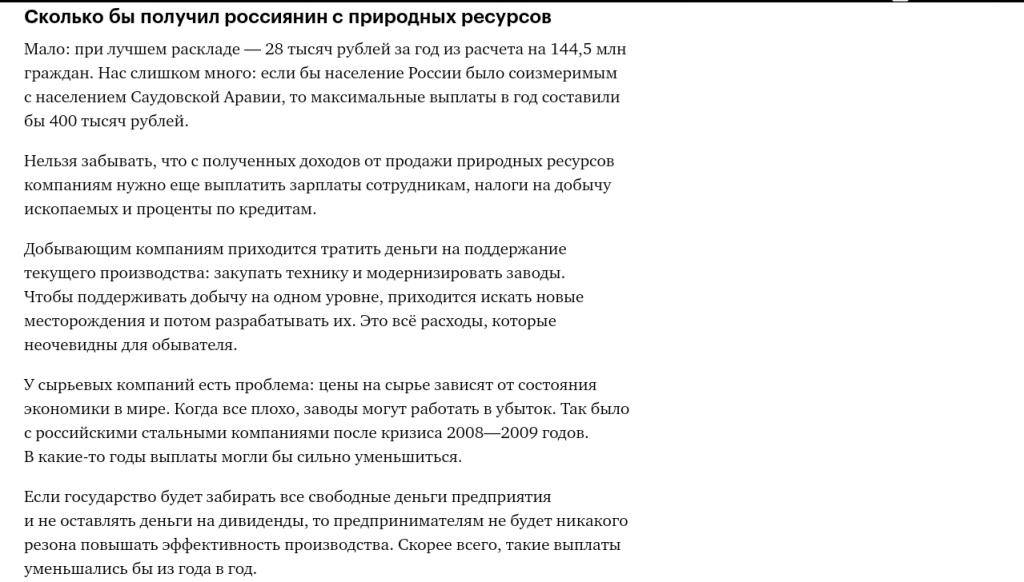 Получается что Россия входит в десятку стран с самыми большими природными ресурсами. Кажется, что россияне станут богаче, если полученные доходы с проданных ресурсов поделить на всех граждан.