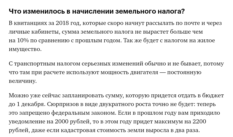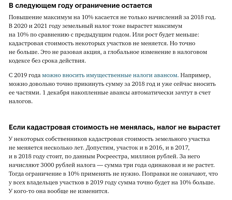 В августе 2018 года приняли поправку по налогу на имущество: он не будет расти больше чем на 10% в год. А с землей такого ограничения не было. Теперь есть.
