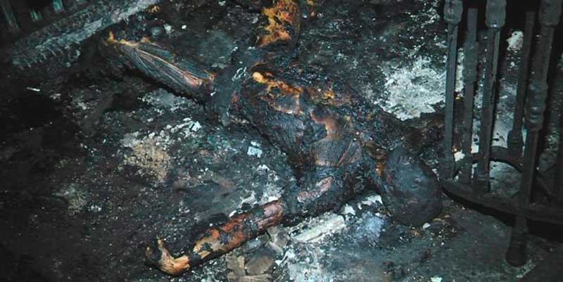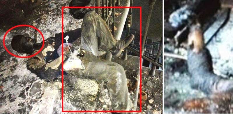 Общей чертой у трупов, как нетрудно заметить, являются сгоревшие плечевой пояс и головы. От груди и ниже пояса - практически целы. Значит, несчастных поливали горючей жидкостью сверху и поджигали. Странным выглядят очки на лице, сохранившиеся, даже когда человек пытался скинуть с головы напалм. Кисти рук и запястья обгорали до костей.