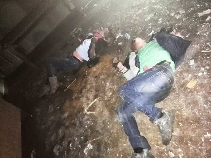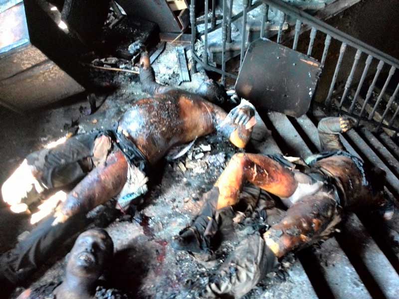 Спрятавшихся на первом этаже за дверями куликовцев атаковали активисты запрещённой в РФ ОПГ «Правый сектор». Все находившиеся на первом этаже жертвы обгорели до костей. Вначале у одного выхода, а позже - у всех трёх.