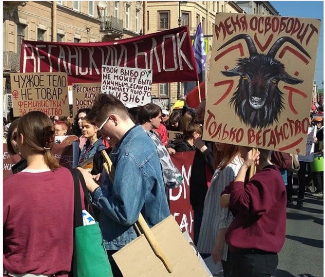 1-го Мая веганы прошли по Невскому вместе с догхантерами и дьяволом
