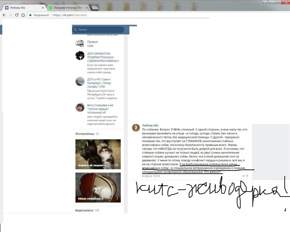 В том числе некая Любовь Kitz из шайки "Кошки Навального" , известная своими милыми сердцу веганов откровениями о том, что бездомных собак надо истреблять, ибо они разрывают на части кошек и домашний скот.