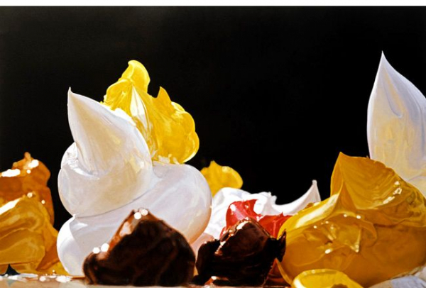 Реалистичные милые картины привлекают внимание публики и являются неплохо продаваемыми. Среди них особое место занимает американский художник Бен Вайнер (Ben Weiner), который рисует в яркой и броской манере краски. Да, вы не ослышались: красками рисует краски! Художник работает в сложной технике: сначала наносит краски на рабочую поверхность, фотографирует, а затем уже само фото берет за основу и с него рисует.