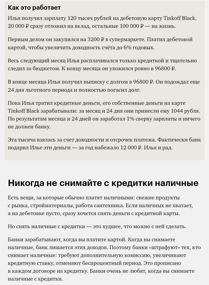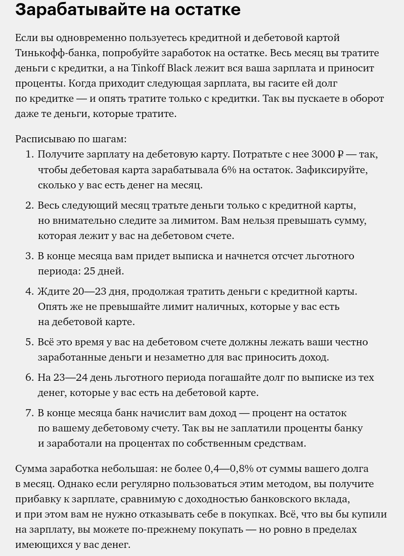 Основная Ваша задача — во чтобы не стало погасить долг до окончания льготного периода. Что бы ни случилось, не доводите до начисления процентов. Каждый месяц сразу после выписки отложите нужное количество денег и можно гасите долг сразу, а лучше всего воспользуйтесь методом «Заработок на остатке», о котором я и хочу Вам поведать..