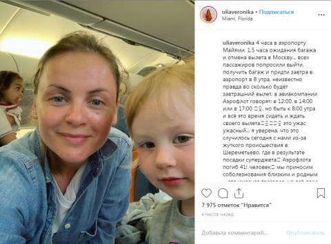 Актриса, супруга певца и композитора Игоря Николаева Юлия Проскурякова пожаловалась в социальных сетях на задержку рейса из Майами в Россию из-за трагедии в аэропорту «Шереметьево». Сообщение исполнительницы вызвало бурную реакцию пользователей.