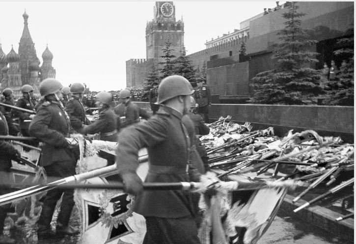 На первом Параде в 1945 году солдаты низвергали знамена Гитлеровской Армии и бросали их к мавзолее. Интересно, но солдаты не хотели этого делать из-за брезгливости, и им выдали кожаные перчатки. А людей, которые выполняли эту функцию, стали называть "носильщиками". Затем перчатки, вместе с фашистскими флагами, были сожжены.