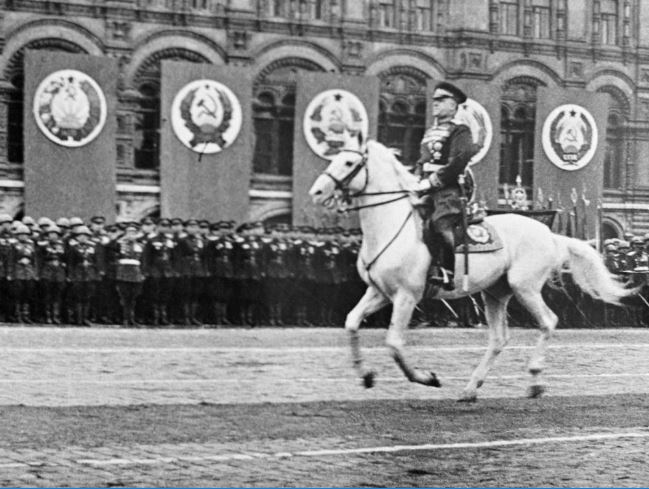 Первый парад принимал на белом коне маршал Жуков. Хотя должен был это делать И. В. Сталин. Но он отказался и сидел на трибуне. Почему? Да просто, чисто случайно, Сталин упал с лошади во время тренировки и повредил ногу, но Жуков с этим поручением справился отменно.