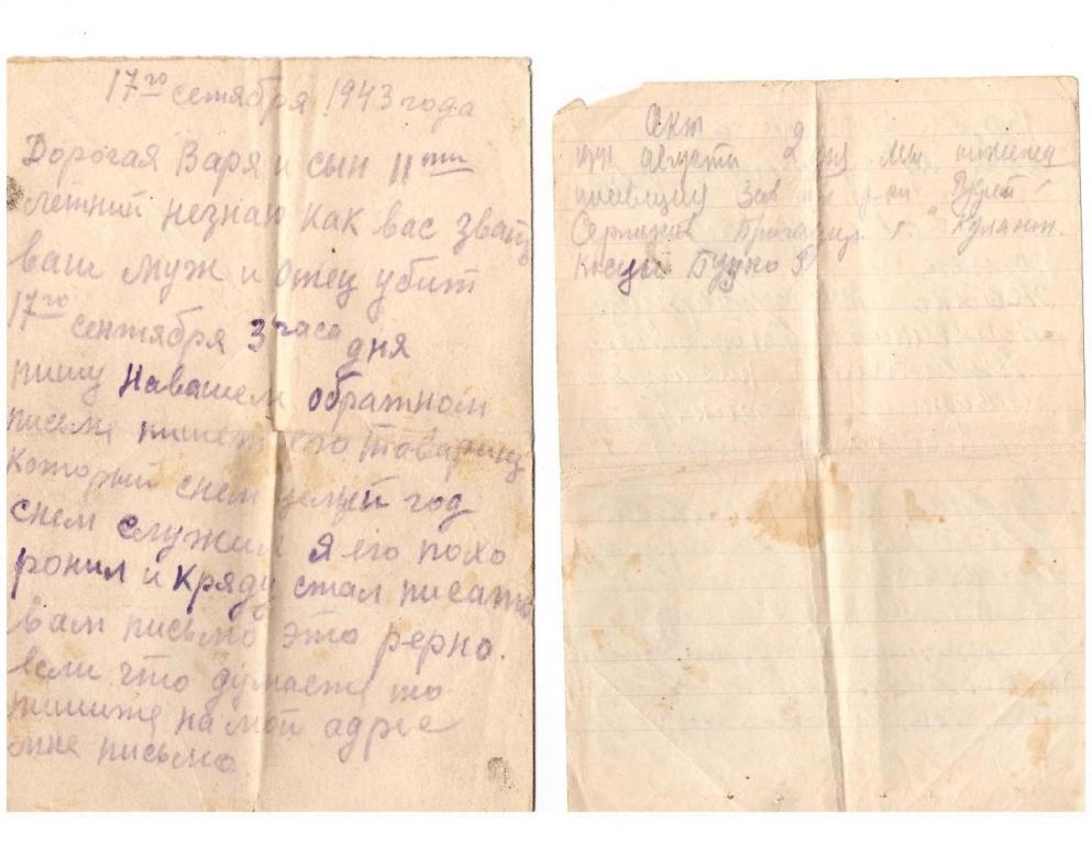 Последняя весточка с войны о муже. Сейчас эти бумаги, написанные возможно крестьянином, возможно рабочим, не шибко грамотным, но искренне переживающим смерть товарища и жуть творящегося вокруг, стали для меня ценными бумагами, унаследованными вместе с нехитрым скрабом моей бабушки. Я смотрю на это письмо, которое видело то время, весь тот беспредел и страх, поселившийся в каждом человеке. Я представляю, как это письмо передавалось из рук в руки, пока шло с фронта до адресата. Думаю, что последнему, кто передавал письмо моей бабушке, было труднее всех. Как же тяжело было тому почтальону, скорей всего женщине, ведь мужики тогда были на вес золота. Представляется картина, как сидят с сухими, потому как уже выплакано всё, ввалившимися от горя глазами, двое, письмоносица и молодая жена, узнавшая, что стала вдовой в неполные… В общем, если б не война, жить бы и радоваться!