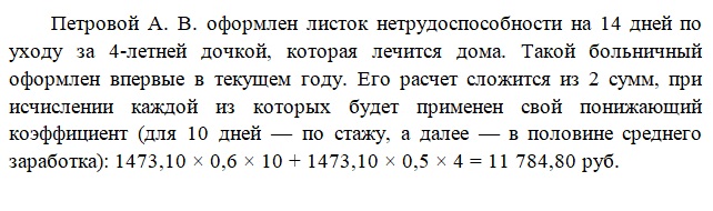 Размера уменьшающих сумму выплаты коэффициентов. Применимо такое снижение только при исчислении платежей по заболеваниям, не связанным с травмой, и в отношении больничных, оформленных по уходу. Для начислений по травматизму и беременности и родам его использовать не нужно (п. 1 ст. 9 закона № 125-ФЗ, п. 1 ст. 11 закона № 255-ФЗ).