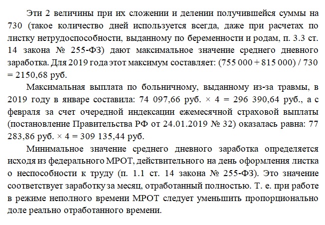 Правила исчисления выплат за периоды нетрудоспособности с наступлением 2019 года не изменились. Обновлены (в сторону увеличения) числовые значения показателей, от которых зависит минимум и максимум среднего дневного заработка.