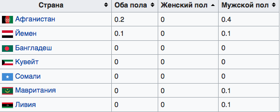 Афганистан, Ливия, Сомали могут похвастаться трезвыми женщинами, там слабому полу пить не принято, именно поэтому в отчете ВОЗ цифры потребленного чистого этилового спирта округлили до нуля. Бангладеш, Кувейт, Йемен может похвастаться сильным полом, мужчины там выпивают пренебрежительно мало.
