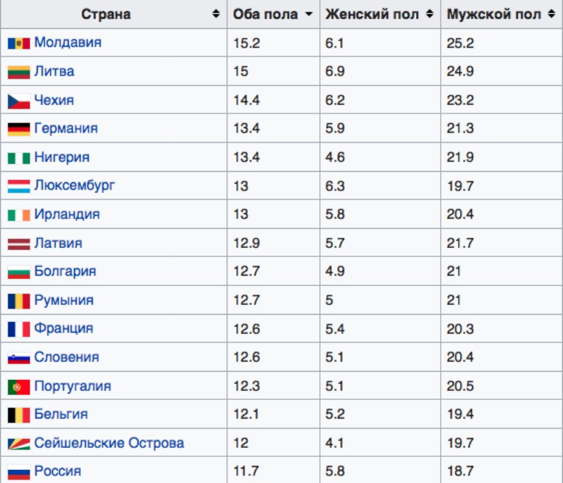 Для сбора статистики решено использовать авторитетный ресурс – в Википедии без особого труда нашел таблицу, составленную Всемирной организацией здравоохранения (ВОЗ) за 2018 год, это максимально свежие данные. Рейтинг составлен исходя из потребления литра чистого этанола в год. Данные меня вполне обрадовали.