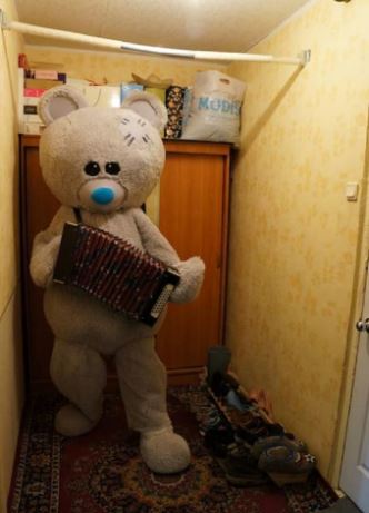 А вот фото обычного большого плюшевого медведя в качестве хозяина-это уже интересно. Ведь он представляет и зал, и кухню, т.е. всю квартиру, пусть даже однушку.