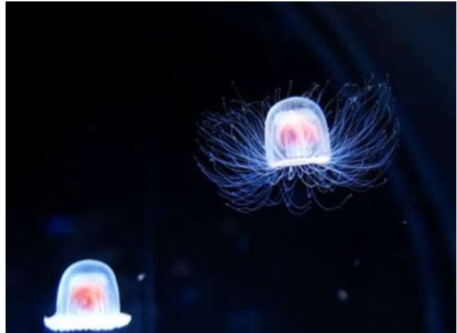 Эта крошечная разновидность медуз, называется Turritopsis doohmii, или бессмертная медуза. Исследования показали, что она нашла способ обмануть смерть, просто изменив процесс старения. Если с ней что-то случается, например, болезнь, травма, она возвращается в стадию полипа, и соответственно ее клетки возвращаются в молодое состояние и жизнь начинается сначала.