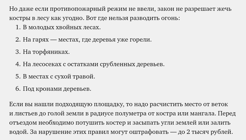 По данным Рослесхоза, в прошлом году в стране произошло около 10 000 тысяч лесных пожаров. Опасный сезон начинается уже в начале апреля. Прямо сейчас можно посмотреть где в России горит лес. По статистике, одна из самых распространенных причин таких бедствий — неосторожное обращение с огнем. Противопожарный режим уже действует в 22 регионах России, там отдыхающим запрещается даже просто посещать леса, не говоря уже о кострах и мангалах. Уточнить, как обстоят дела с пожароопасностью в вашем регионе, можно в местной администрации или управлении МЧС.