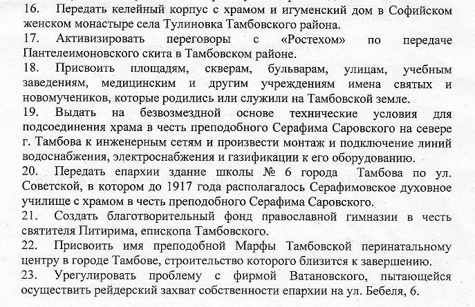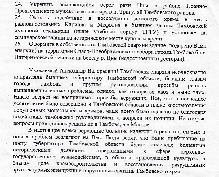 В Тамбове уже прогремел скандал из-за, так называемого " черного списка " митрополита Тамбовского и Рассказовского Феодосия – его письма нынешнему тамбовскому губернатору Александру Никитину. Это послание состоит аж из 26 пунктов. В Интернете это послание именуют - «Губа не дура».