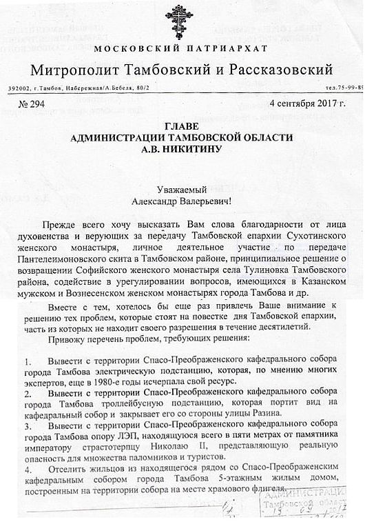 Церковная территориальная экспансия не афишируется. Даже письмо митрополита к губернатору попала в общий доступ совершенно случайно.