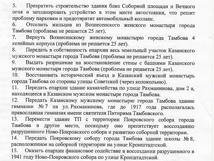 В российском городе Тамбов местное духовенство обратилось к власти с просьбой построить автостоянку для паломников рядом с Вечным огнем, переселить людей из их жилья на бывшей сто с лишним лет назад церковной земле, переименовать городские площади, улицы, бульвары, учебные заведения и больницы в честь святых и закрыть три действующие школы под нужды епархии. Ни больше, ни меньше...