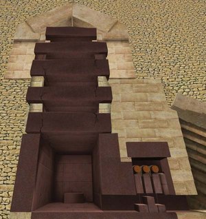 Конечно, это не могло не повлиять на долговечность сооружения. К эпохе фараона Хеопса наружная поверхность пирамиды была - как теперь она у Сфинкса. Из-под песка торчала лишь самая верхушка Пирамиды с 4-5 метровым гранитными пирамидальным блоком. Вент. каналы давно были засыпаны наносами песка. Внутри стояла жуткая духота и свита не могла сопровождать своего фараона. Они бы там все после запечатывания задохнулись уже через несколько дней. Фараона сопровождали в месячном заточении в пирамиде лишь двое-трое слуг. Но и они начинали испытывать проблемы нехватки воздуха уже через 2-3 недели. К концу 4-ой недели все они уже еле ползали по тёмным каналам внутри пирамиды, потеряв счёт времени. Макет внутренних помещений пирамиды уже давно был засыпаны песком и замурованные в пирамиде люди плохо знали её внутреннее устройство. Так как уже не требовалось большие запасы жидкости, «Саркофаг» перестали наполнять вином, а хранили его в обычных небольших бочках.