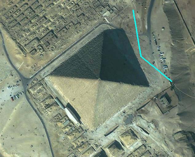 Объём конического 30º-го холма высотою 120 метров, у которого только южная часть имеет уклон 1:10 составляет примерно 44 млн м³. Вычитаем объём самой пирамиды 2.6. Египтянам для строительства надо было перевезти из пустыни более 40 млн м³ песка. Упорства им видимо было «не занимать» …