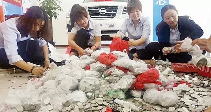 В городе Цанчжоу, Китай, женщина расплатилась за свою новую машину 13 тысячами монет