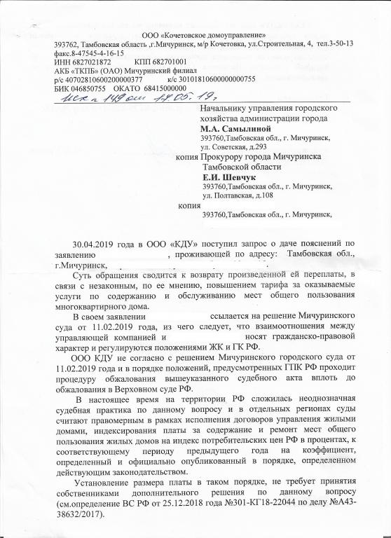 Не случайно в судебном заседании представитель ответчика отрицала преюдициальный характер решения мирового судьи судебного участка №5 г. Мичуринска от 28.06.2018 г. по отношению к настоящему делу. Но, т. к. мнение ответчика противоречило закону, суд правильно его оценил при вынесении решения. В договоре управления МКД, на который ссылается ответчик, прямо прописана возможность изменения тарифа за техобслуживание, но только на основании нормативно-правовых актов. Ни одного нормативно-правового акта ответчик в обоснование своей позиции не привел. Приводя в жалобе ссылки на судебную практику ВС РФ, ответчик умалчивает о том, что обстоятельства в делах, рассмотренных Верховным судом, и в настоящем деле разные. Кроме того, ответчик не учитывает того, что право в РФ непрецедентное и каждый конкретный случай рассматривается судом индивидуально. Ответчик ничего не делает по содержанию дома. Я ассоциирую его с татаро-монгольским игом, при котором татаро-монголы собирали с Руси дань, постоянно её повышая.