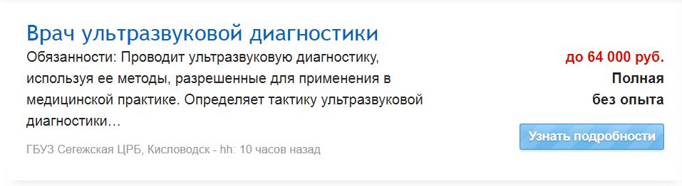 Это лишь одно из многих предложений поработать врачом в Кисловодске. Не говоря уже о дополнительных заработках в многочисленных санаториях вашего края.