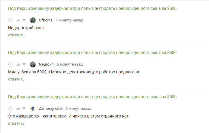 В конце прошлого месяца в Навоийской области сотрудники прокуратуры и органов внутренних дел задержали женщину при попытке продать своего шестилетнего сына за 15 млн сумов ($1770). В марте в том же регионе 38-летняя жительница Карманинского района пыталась продать своего новорожденного сына за 5 млн сумов.
