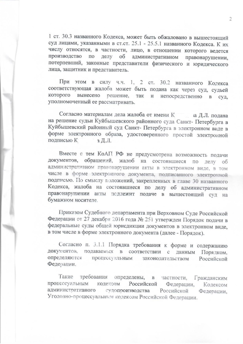 - кроме того, приказом Судебного департамента при ВС РФ от 27 декабря 2016 г. № 251 утвержден Порядок подачи в федеральные суды общей юрисдикции документов в электронном виде, в том числе в форме электронного документа (далее – Порядок). Согласно данному Порядку документы в электронном виде, в том числе в форме электронного документа, подписанного электронной подписью, посредством заполнения формы, размещенной на официальном сайте суда, могут быть поданы в суды только в рамках гражданского, административного и уголовного судопроизводства. А документы, обращения, жалобы по делам об АП не могут быть поданы в суд общей юрисдикции в электронном виде, поскольку производство по таким делам осуществляется по правилам КоАП РФ, нормами которого не предусмотрена подача таковых в электронном виде.