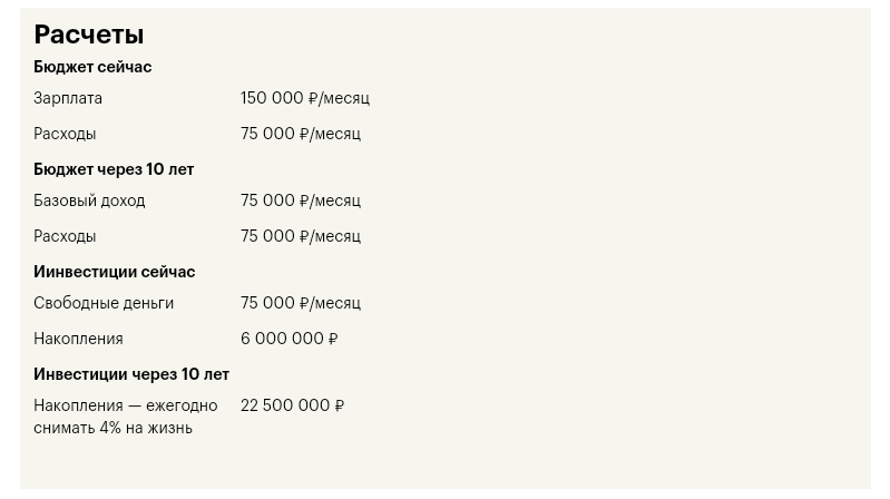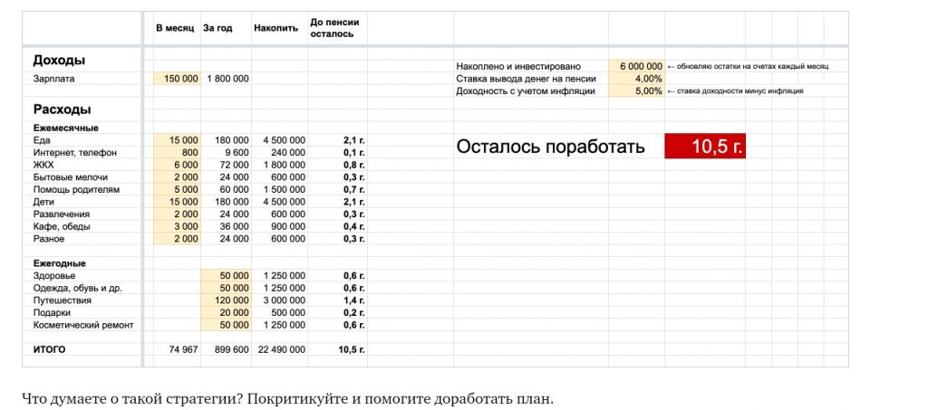 Поэтому как Вы понимаете сумма в 22,5 млн взята была не с потолка. В своих расчетах она использовала правило 4%, которое основано на многолетних исторических данных фондового рынка: можно каждый год снимать с инвестиционного счета 4% и жить на эти деньги 30 и более лет. А вот так она считала...