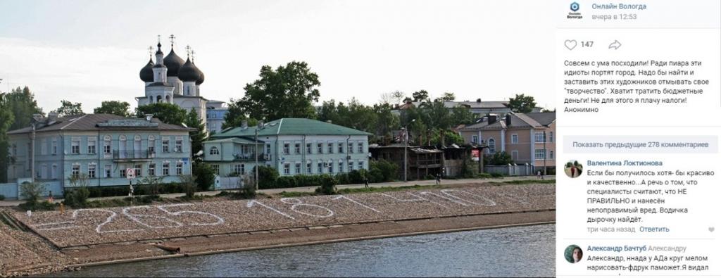 Напомним, 11 июня утром вологжане увидели на набережной реки Вологды надпись метровыми буквами, нанесенную мелом «265 181 410». Как пояснили в группе ВК «Настоящая Вологда», цифры соответствуют стоимости контракта, заключенного с ООО «Магистраль» на работы по берегоукреплению – более 265 миллионов рублей.