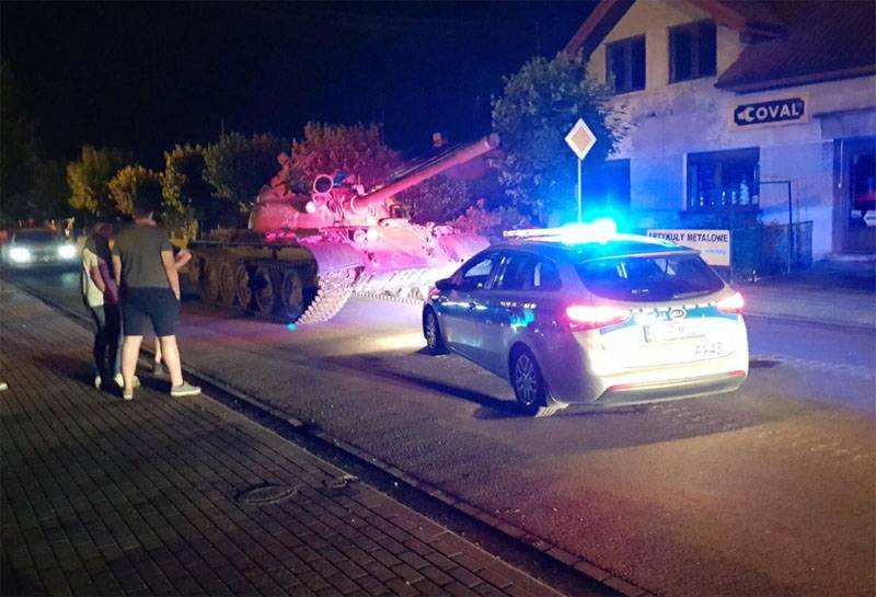 Доблестные польские полицейские перекрыли дорогу танку патрульными автомобилями предварительно благоразумно убедившись в том «танкист» не собирается идти "на прорыв".