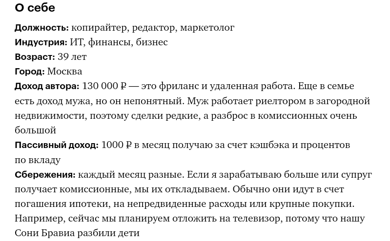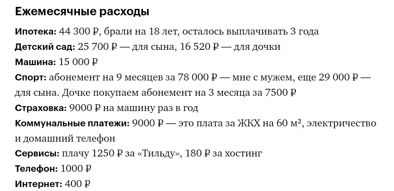 Видно что люди живут по минимуму - не позавидуешь. Особенно убивают цены на садик для детей - какая то частная лавочка среднего пошиба, нормальные частные детские сады в Москве от 50000 в месяц. По первому впечатлению на еде можно несколько сэкономить, но если идти этим путём то можно дойти до одной картошки и говорить, что всё нормально, но это путь в никуда. Мне кажется что автор несколько лукавит, утаивая зарплату мужа - в загородной недвижимости, а тем более Подмосковной, сделки даже если и редкие, но меткие. Даже если и одна в месяц, то это не один десяток тысяч - по минимуму, а это несколько меняет дело... В общем нужен более полный расклад, да и в целом из публикации не понятно, то ли огорчаться за автора, то ли радоваться, что она такая вся из себя на фрилансе и удалённой работе... ...