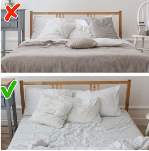 Казалось бы, что уж тут-то не так. Все хотят, уйдя на работу, оставить дома порядок, да и такое интимное место как кровать оставить прикрытой. Но, оказывается, сразу после сна постель убирать не рекомендуется, так как в ней остается нежелательный гигиенический фон. Когда человек встает с постели, там остается немного влажности и тепла, прикрывая постель, вы создаете благоприятную среду для развития пылевых клещей и прочих микроорганизмов, образующихся в средах с клетками омертвевшей человеческой кожи. А потом вечером туда же ложитесь и сами.
