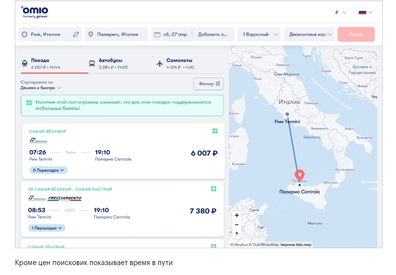 Вы планируете посетить несколько городов, и желаете сделать это по собственному маршруту, то поможет сервис ''Омио'': он Вам покажет стоимость билетов из пункта «А»☝ в пункт «Б»☝ на поезде, автобусе и самолете, и причем сразу скажет цену в рублях.