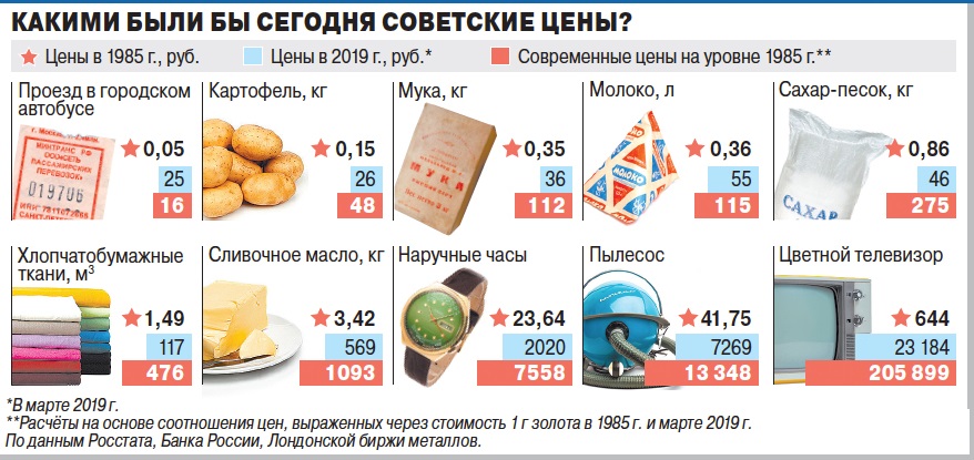Кстати для тех кто считает, что продукты питания стоят непомерно дорого - перевод продовольственных цен 1985-го в цены 2019-го на основе золотого эквивалента даёт неожиданный результат: они получаются заметно выше, чем в магазинах сегодня. Если то же сливочное масло стоило бы сейчас на советском уровне, за 1 кг пришлось бы платить 1093 руб. вместо 569, а за литр молока — 115 руб. вместо 55 (см. инфографику). Да и ещё на всякий случай, качество ГОСТовских продуктов и продуктов сегодняшних (из доступных большинству) не сравнивается!
