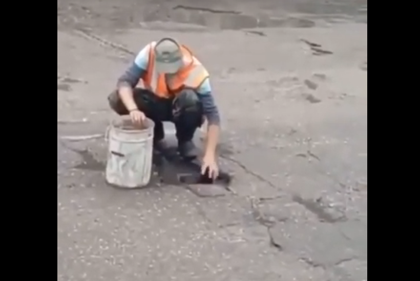 Инцидент, попавший на видео, произошел в городе Свободный Амурской области. На записи видно, как мужчина в спецодежде собирает воду тряпкой и выжимает ее в стоящее рядом ведро. Голос за кадром поясняет, что данное действо является подготовкой к «ямочному» ремонту.